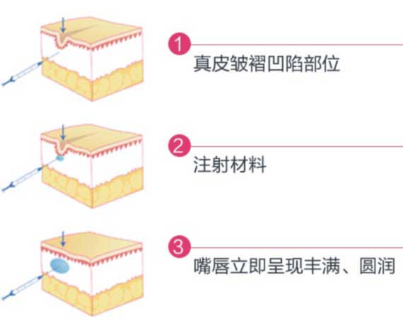 通过针剂将瑞兰、伊婉等玻尿酸填充物,注入真皮皱褶凹陷部位,可以使嘴唇立即呈现丰满、圆润。您的双唇将保持令人羡慕的水润与光泽。