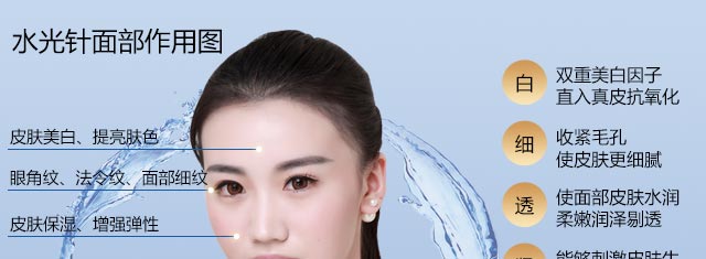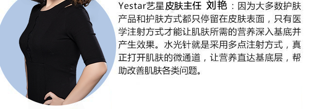 艺星水光针利用特色针头将营养液注入皮肤真皮层,深度补充肌肤所需养分, 快速修复\受损干瘪细胞,刺激再生,帮助肌肤重塑张力,恢复水润 透亮、白皙Q弹,终结暗沉、色斑、细纹等问题。