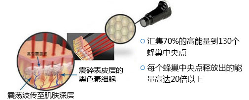 皮秒蜂巢镭射激光是采用755波长激光并搭配蜂巢瞬效透镜(Focus)将70%雷射能量汇集聚焦,每发雷射光提供皮肤组织10%的高效震荡波作用,震碎表皮层的黑色素,同时更将震荡波传导至深层真皮层,启动修复生长因子,促进胶原蛋白和弹性纤维的更新与增生,加速皮肤的新陈代谢,使黑色素加速代谢排出体外,从而解决深层色素问题。