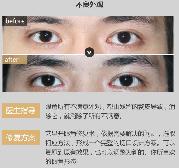 艺星开眼角修复技术通过眼角处皮瓣转移调整眼角形态、位置、角度及两眼与面部的比例关系,精细,消除传统开眼角手术造成的诸多并发症。